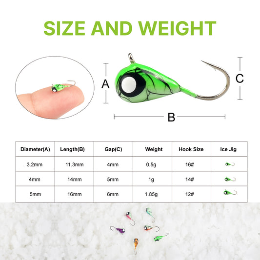 MUUNN New 21pcs Tungsten Glow Ice Fishing Jigs With Premium Jig Box,3.2mm~6.0mm Winter Ice Hooks Pike Carppie Perch Panfish Lure