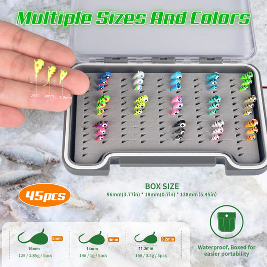 MUUNN 45pcs Tungsten Ice Fishing Jig Head Set,Boxed Winter All Glow Color 0.50G - 1.85G Multicolor Hook Perch Bluegill Crappie Ice Soft Lure Tackel