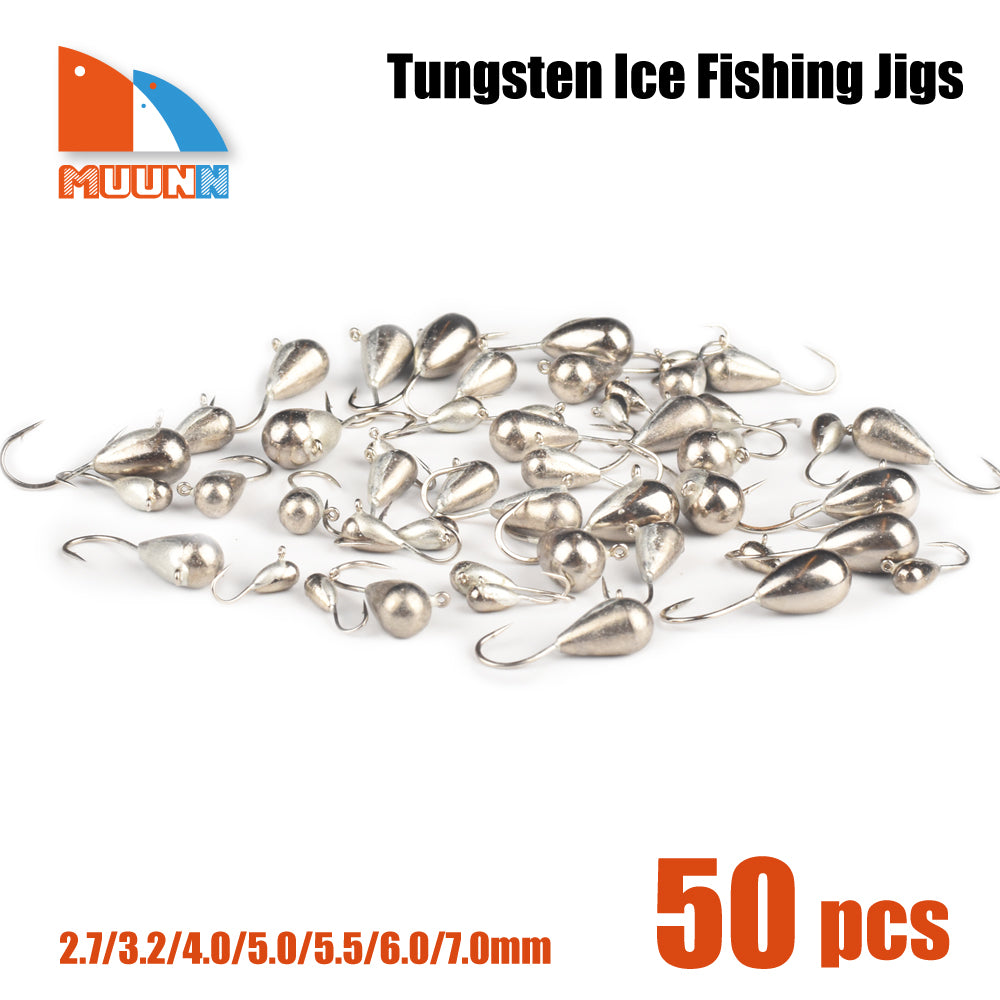 MUUNN 50PCS Tungsten Tear Drop Ice Jigs,Winter Hook Plain 2.7mm/3.2mm/4mm/5mm/5.5mm,Pike Trout Perch Lure Tackel