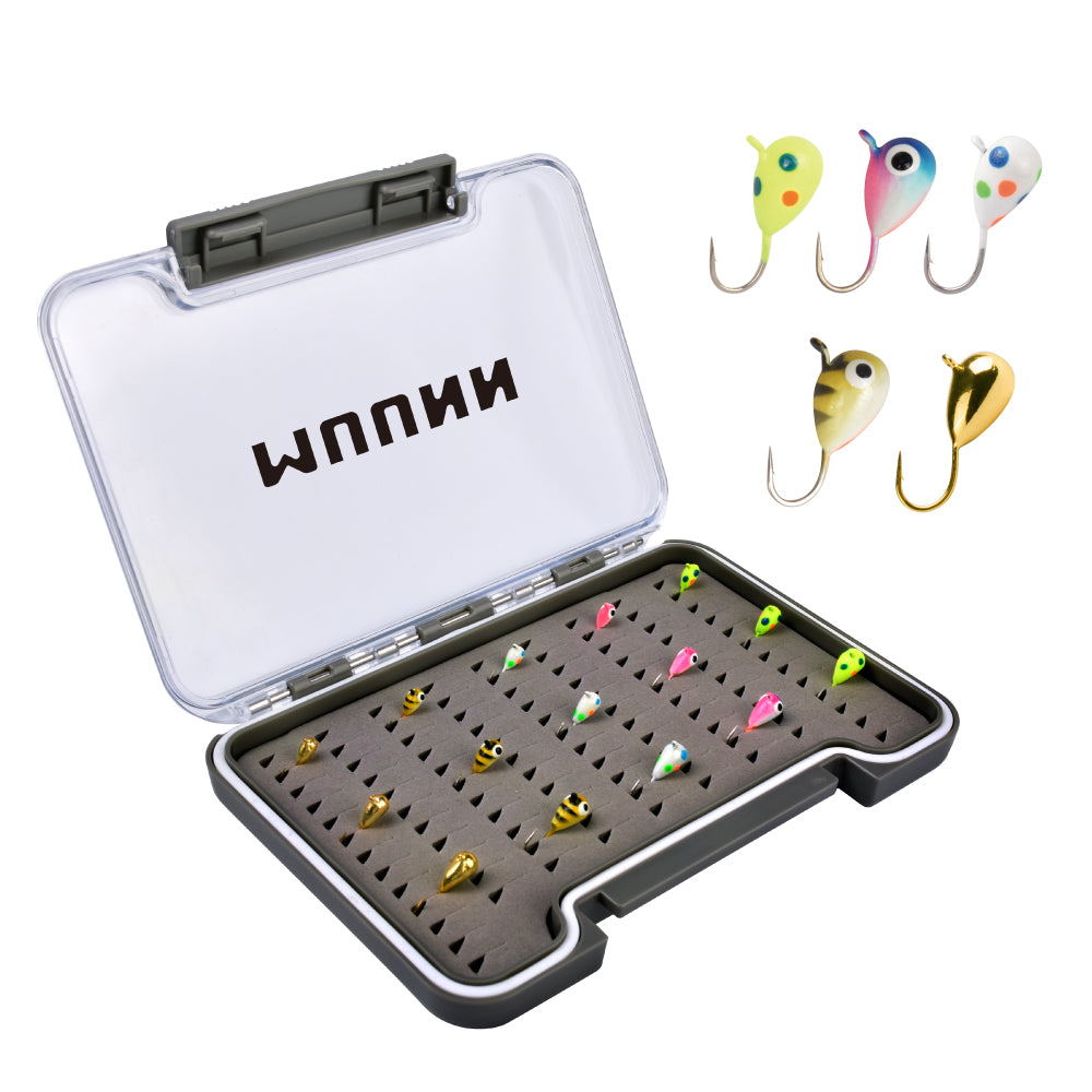 Put the Ice Fishing Jig in the box for better carrying and storage, more convenient and safer,Bring better ice fishing experience. The ice hook set has a high-quality box and excellent performance,It's a great gift for family and friends. Box Made of sturdy and solid PC+ABS well-sealed with rubber gaskets offering effectively waterproof performance to keep your jig dry. Any weather conditions will not affect your needs. A box of 15 products, with 6 colors, 3 sizes.Suitable for different scenes, meeting various needs. Bionic color coating and excellent luminous effect provides constant fish-enticing action.