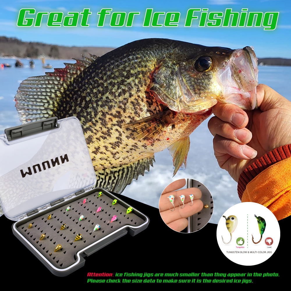 MUUNN 15pcs Tungsten Ice Fishing Jig Kit,Boxed UV Glow Jigs,Multicolor Hayabusa Hook Winter Perch Crappie Bluegill Softlure Bait